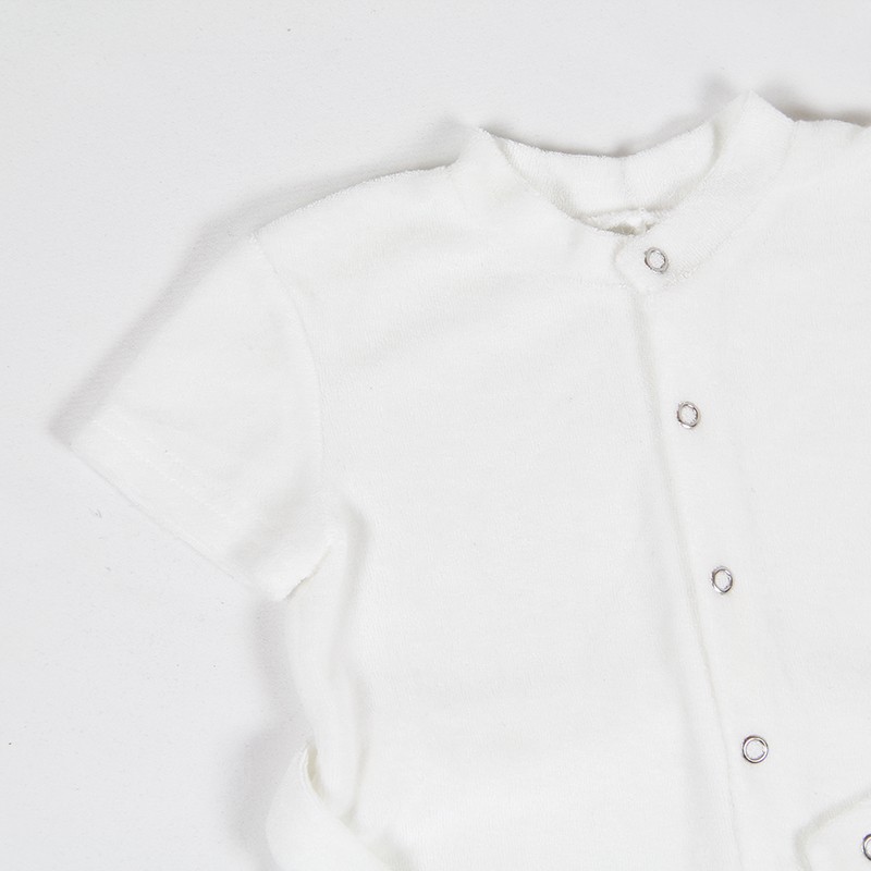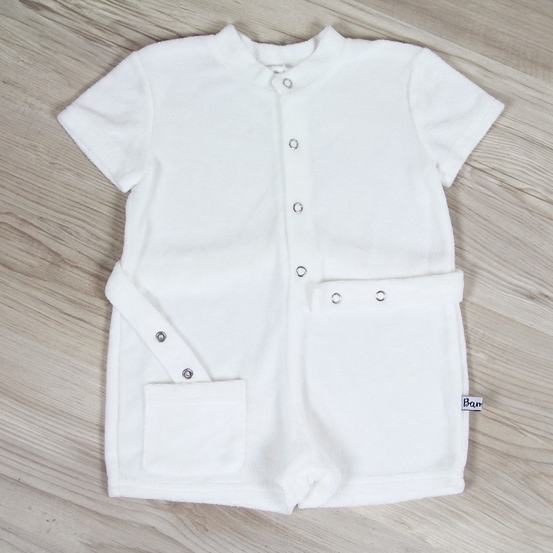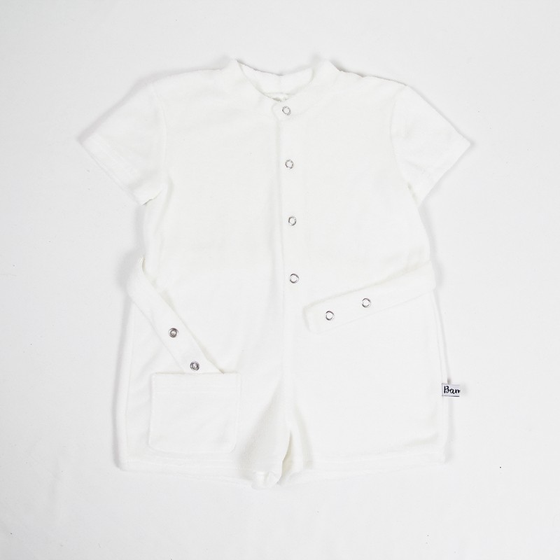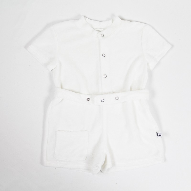 Vêtement bébé estival en micro éponge très agréable au toucher, la combi-short allie style et confort. Manches courtes, ouverture pressionnée devant et poche plaquée, une petite ceinture complète la tenue. Ce vêtement bébé écolo une pièce est fabriqué en tencel blanc, confection française.